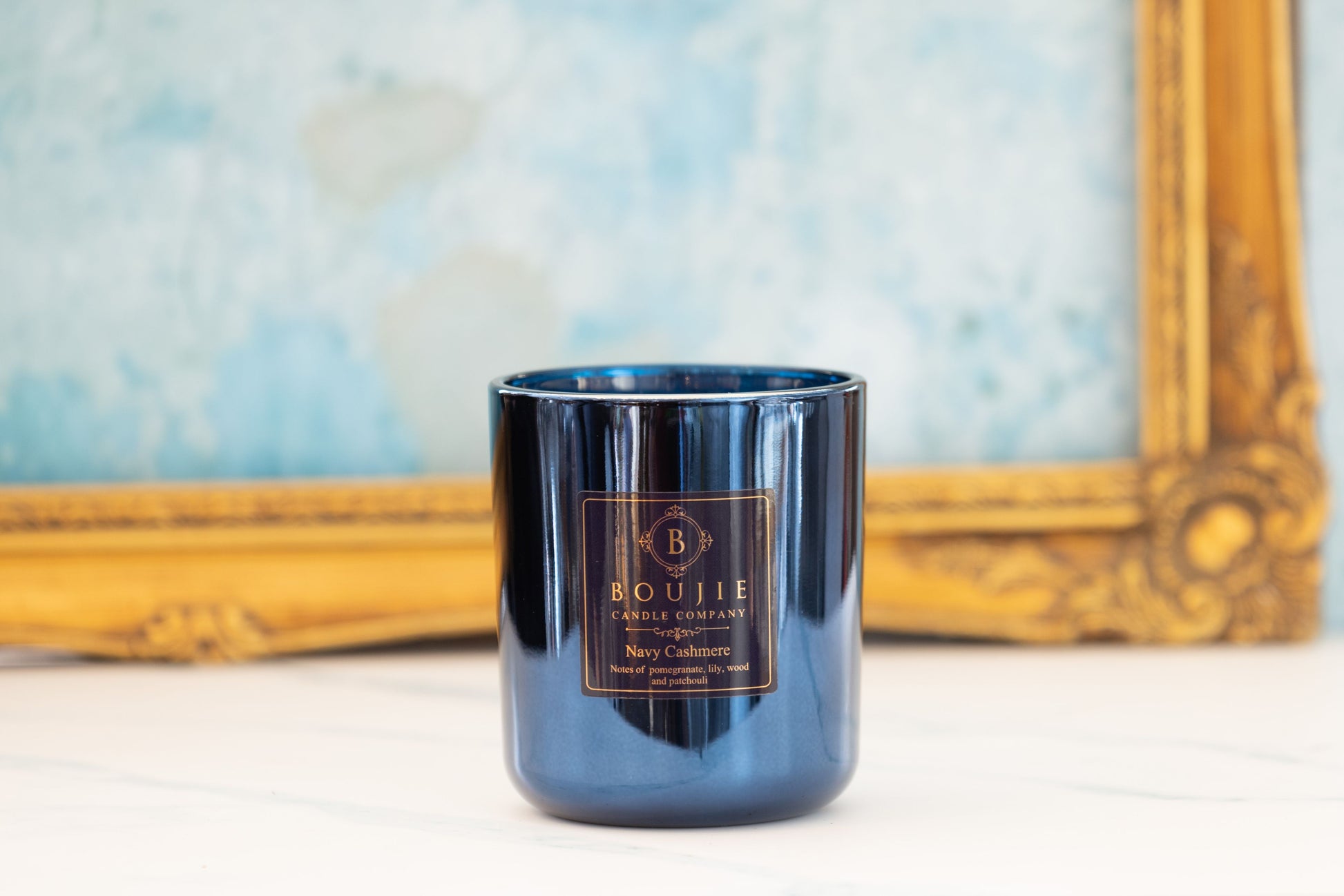 Transform your home into a cozy sanctuary with Boujie Candle Company's exquisite Navy Cashmere candle. This captivating fragrance is carefully crafted with a harmonious blend of pomegranate, Lily, wood, and patchouli notes. As you light this enchanting candle, prepare to be transported to a world of warmth and elegance. The soothing scent of Navy Cashmere delicately fills your space, creating a comforting and inviting ambiance. Experience the gentle embrace of pomegranate and Lily, beautifully combined with the earthy essence of wood and the subtle hints of patchouli. Let this captivating aroma wrap your surroundings in a luxurious embrace, making your home feel like a haven of tranquility and enveloping it in an enchanting scent that lingers delightfully.